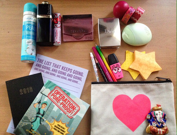 Pour parer tout effet coup de chaud ou coup de stress et rester fraîche comme une rose tout au long de la journée vous aurez besoin du kit Pore Proof de Benefit , allié imbattable pour se défendre contre le pic de production de sébum de 11h (et oui nous sommes tous concernés!), de papier matifiant (ceux de Séphora sont top, celui là est parfumé à la rose), un fond de teint crème avec miroir et éponge integrés pour les éventuelles retouches, d’un mini déo hyper discret et efficace et enfin de votre parfum préféré, moi c’est Dior Addict eau de parfum. On ne fait pas l’impasse sur la creme pour les mains au concombre et le baume fruits rouges d’Eos.