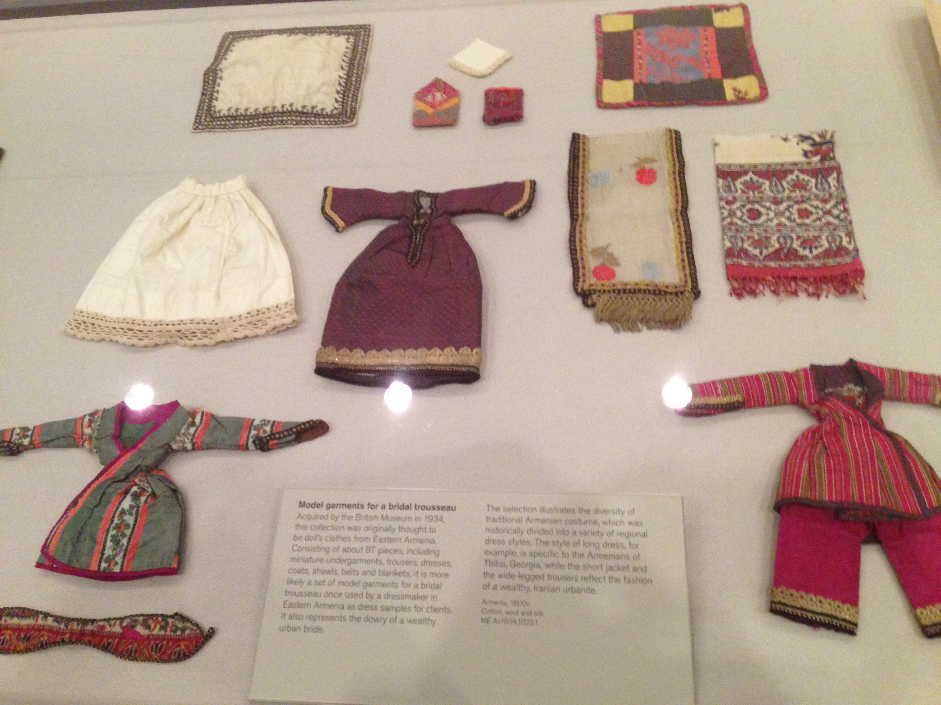 A l’époque les contrats de mariage étaient systématiquement établis. Sans doute parce qu’on se mariait rarement par amour et plutôt par intérêt, les familles devaient bien s’en mêler (ah elles s’en mêlent toujours?). On rédigeait ces contrats en arabe sur de magnifiques parchemins ornés de motifs tels que le boteh (en bleu sur la photo ci-dessus), arrivé en europe sous le nom de paisley et diffusé en masse dans le textile lors de la révolution industrielle, mais ceci est une autre histoire… Les contrats de mariage faisaient mention de tous les biens ou propriétés transmis par le mariage ainsi que de la dot. Les mariées avaient également des trousseaux, composés de vêtements, meubles et objets pour la maison où elles allaient emménager juste après le mariage. Sur la photo, vous pouvez voir la reconstitution miniature du trousseau d’une mariée arménienne, composé de 87 pièces au total!